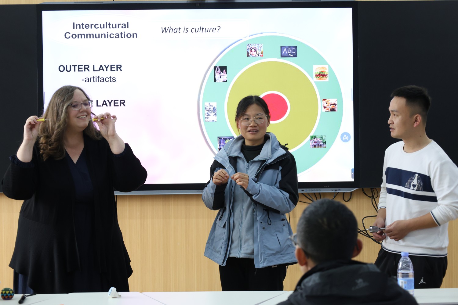 Saloam老师结合Schein的文化三层模型和Hofstede的文化维度理论,深入浅出地讲解了文化差异的多个层面,包括个体主义与集体主义、不确定性规避、权力距离等。随后,Saloam老师拿出了从美国带来的几件日常生活中常用的小道具,邀请在场中国老师猜测其用途,现场气氛活跃,笑声不断。她还结合自己在中国工作多年的亲身经历,分享了跨文化适应的有趣故事。从最初对电蚊香液的不会使用到后期的依赖,再到后来学会和邻居的叔叔阿姨一起包饺子,这些鲜活的生活细节让老师们对文化表层与核心的差异有了更直观和深刻的理解。