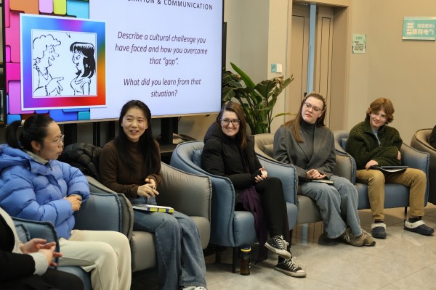 短暂的中场休息后,跨文化交际主题研讨接续进行。外籍教师Sam、Lauryn、Riley与淬炼商学院杨毅鹏老师、艺术传媒学院韩雅琳老师、商务英语学院许晓晴老师围绕跨文化差异认知、交际挑战应对等话题展开交流。Lauryn老师结合自身在多元文化环境成长的经历,分享了对文化多样性的理解与接纳经验;韩雅琳老师则讲述了其在尼泊尔担任志愿者期间的跨文化体验,强调入乡随俗的包容心态,并提及将这种包容理念融入辅导员工作,理解接纳不同个性的学生。