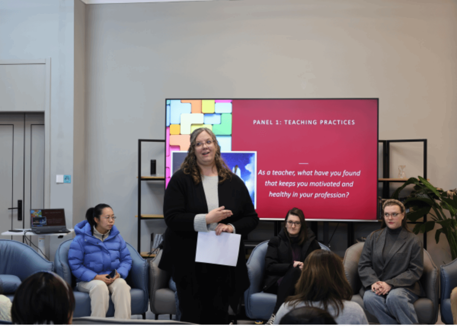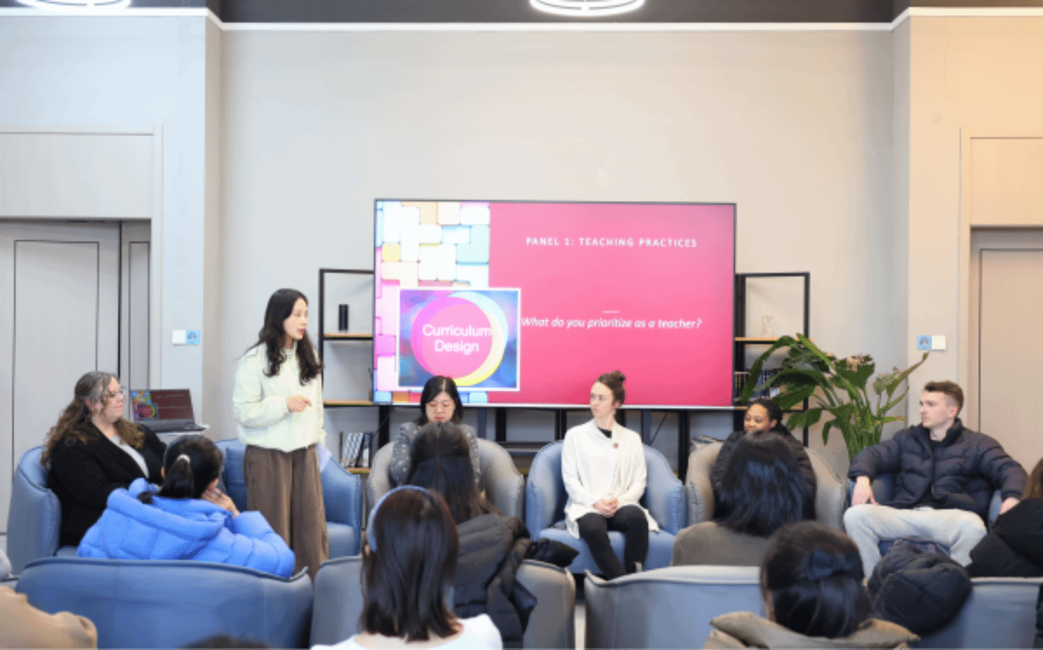 本次培训由国际化师资培训主讲教师Saloam担任主持人。活动伊始,教学实践主题研讨率先开展,外籍教师Kristin、Tabi、Sean与淬炼商学院·国际商学院张杏利、焦晶老师及商务英语学院温静老师组成讨论小组,围绕教学核心原则与实践难题各抒己见。Saloam老师以“What do you prioritize as a teacher?”(作为教师,你最优先考虑的是什么?)抛出议题,引发全场热烈讨论。